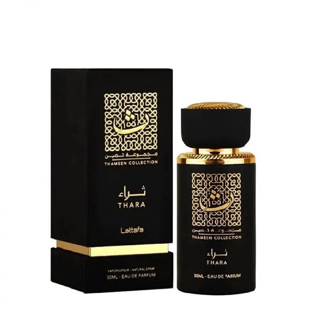 Apresentando Thara, um perfume tentador da Thameen Collection da Lattafa Perfumes. Esta fragrância luxuosa abre com notas de topo de pimenta da Jamaica, frésia roxa e heliotrópio, seguidas por um coração de jasmim, flor de hibisco e rosa búlgara. Notas de base de cedro do Himalaia, acorde de pele quente, sândalo e incenso completam este perfume sublime.